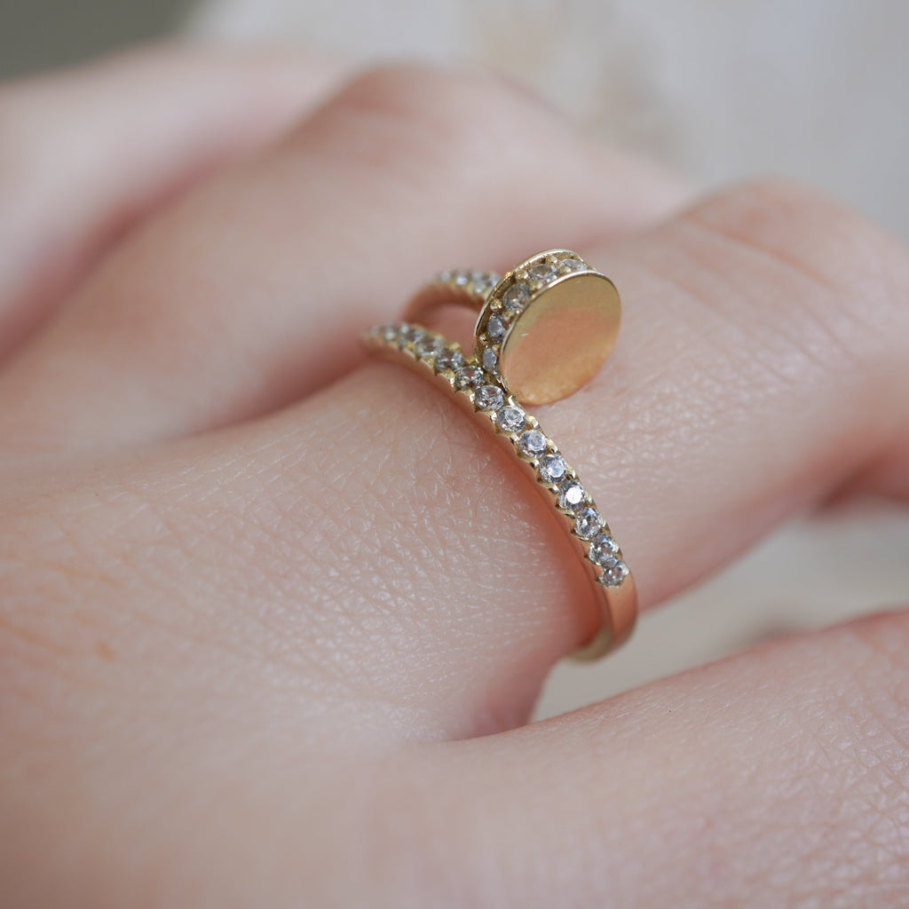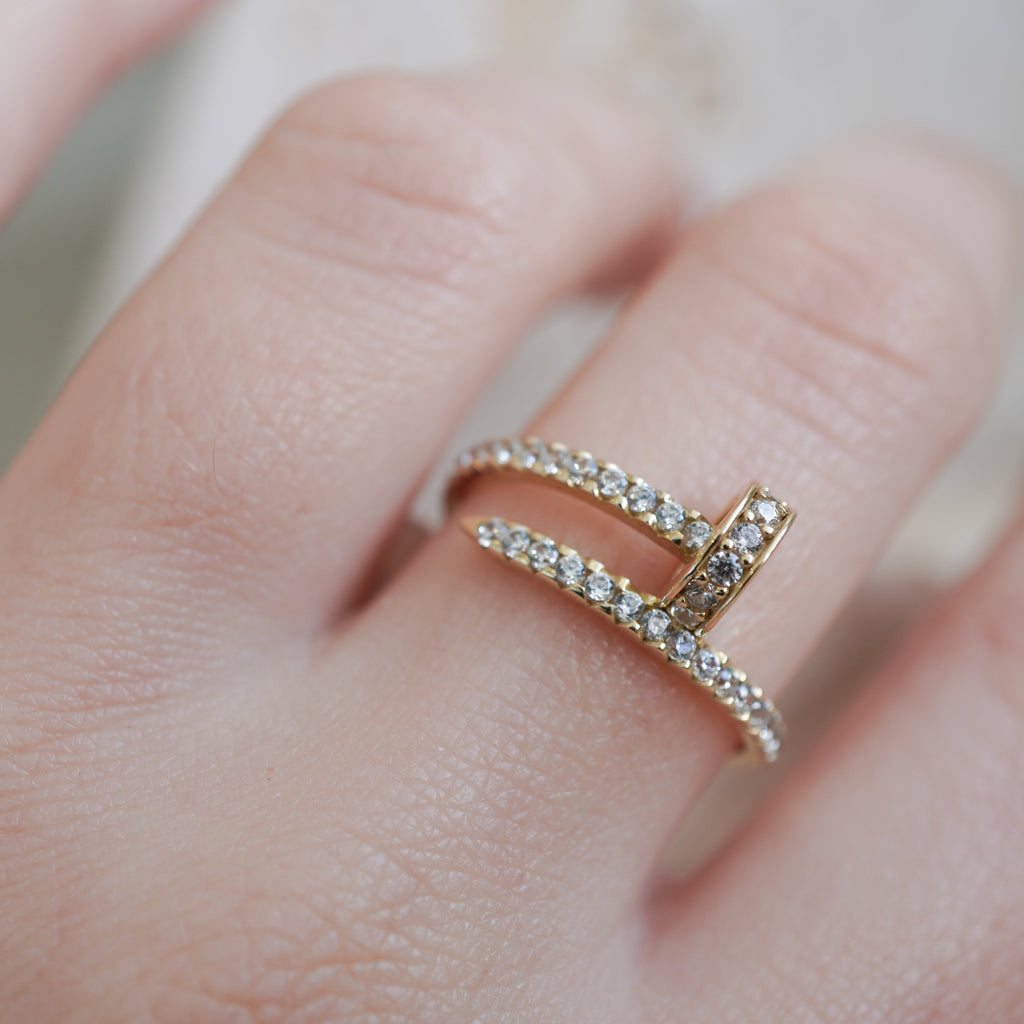 This 10k yellow gold nail ring blends minimalist design with elegant charm, creating a unique statement piece. Its sleek, modern silhouette adds subtle sophistication to any outfit, making it perfect for daily wear or special occasions. Crafted to highlight simplicity and style, this ring effortlessly enhances your look with a touch of refined beauty.