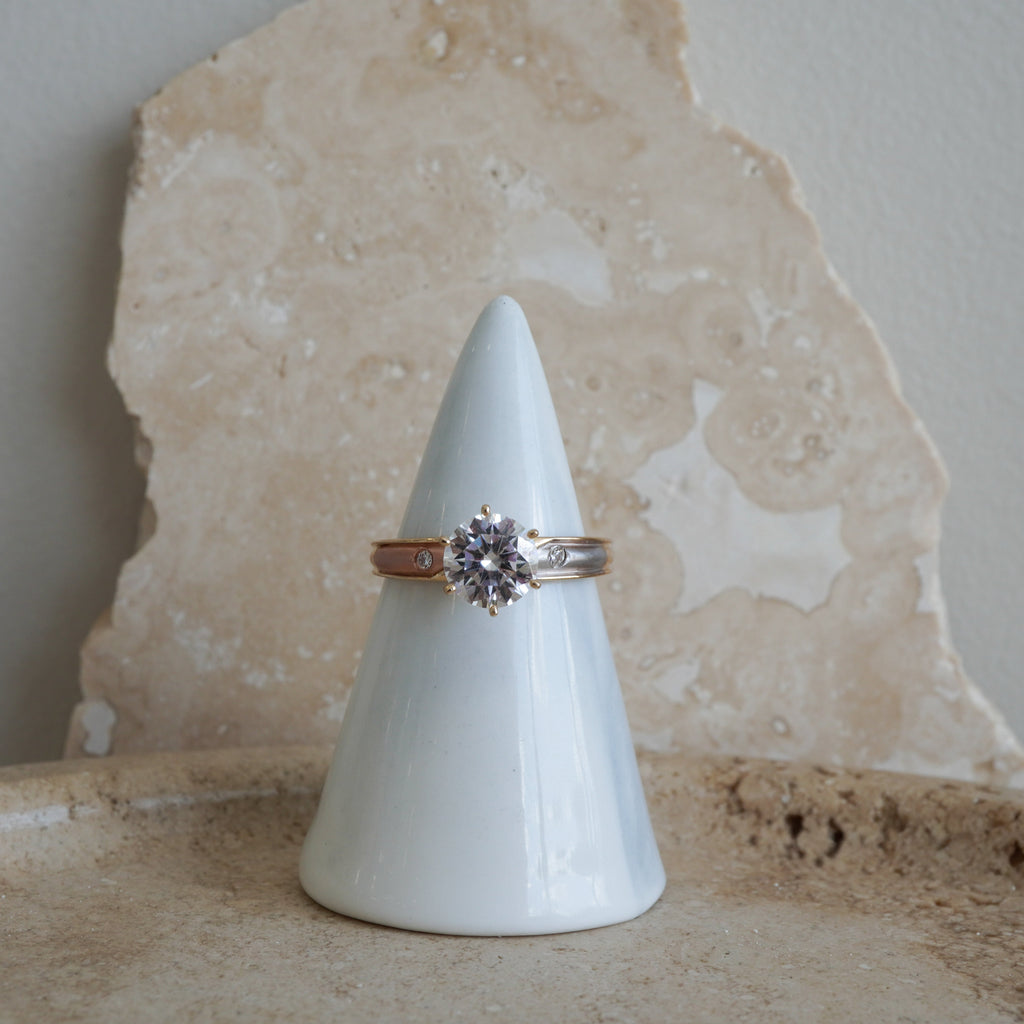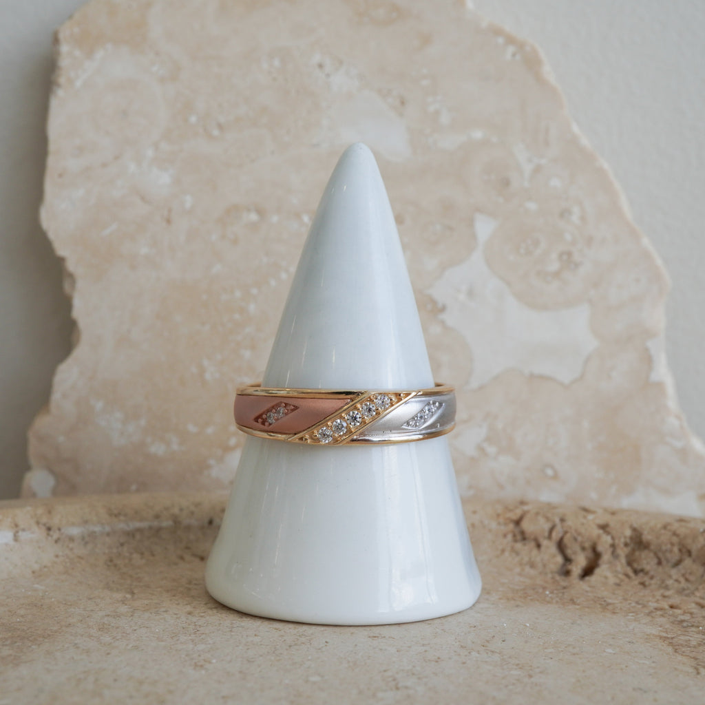 This elegant 14k three-tone gold trio set includes a stunning engagement and wedding ring designed for women, paired perfectly with a matching men's band. Featuring a harmonious blend of yellow, white, and rose gold, the women’s rings are adorned with sparkling zirconia that adds timeless brilliance. Crafted for lasting beauty and comfort, this set symbolizes unity and commitment with a sophisticated, versatile style that complements any occasion.