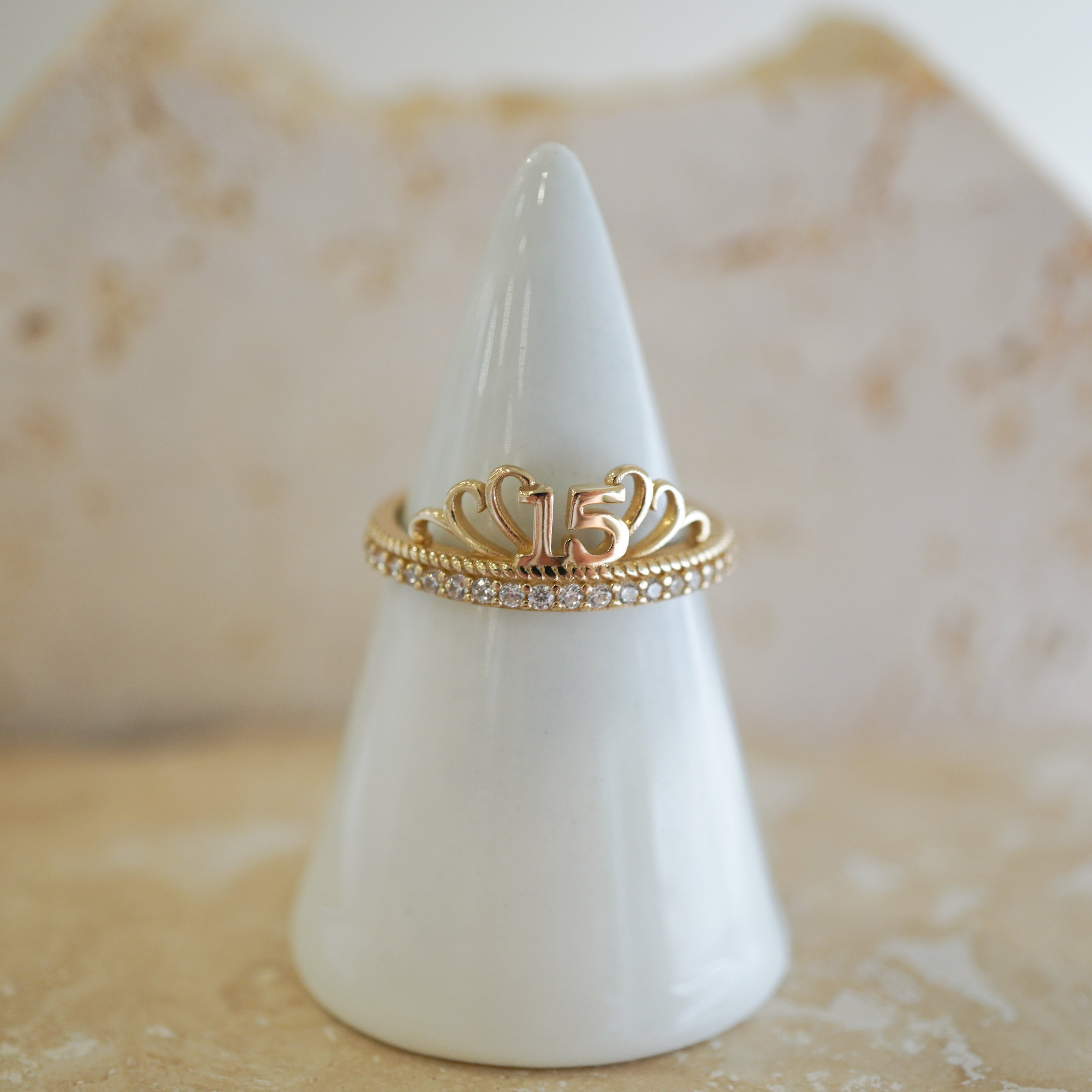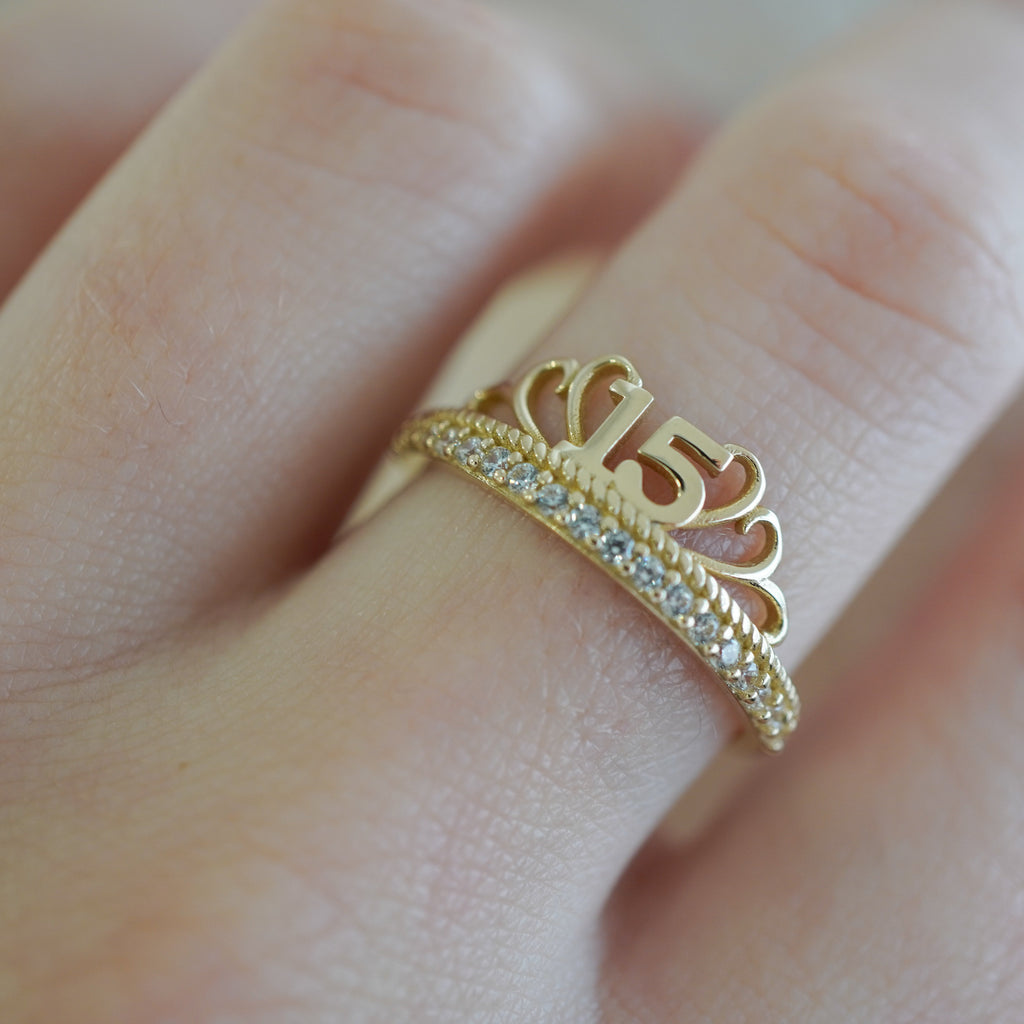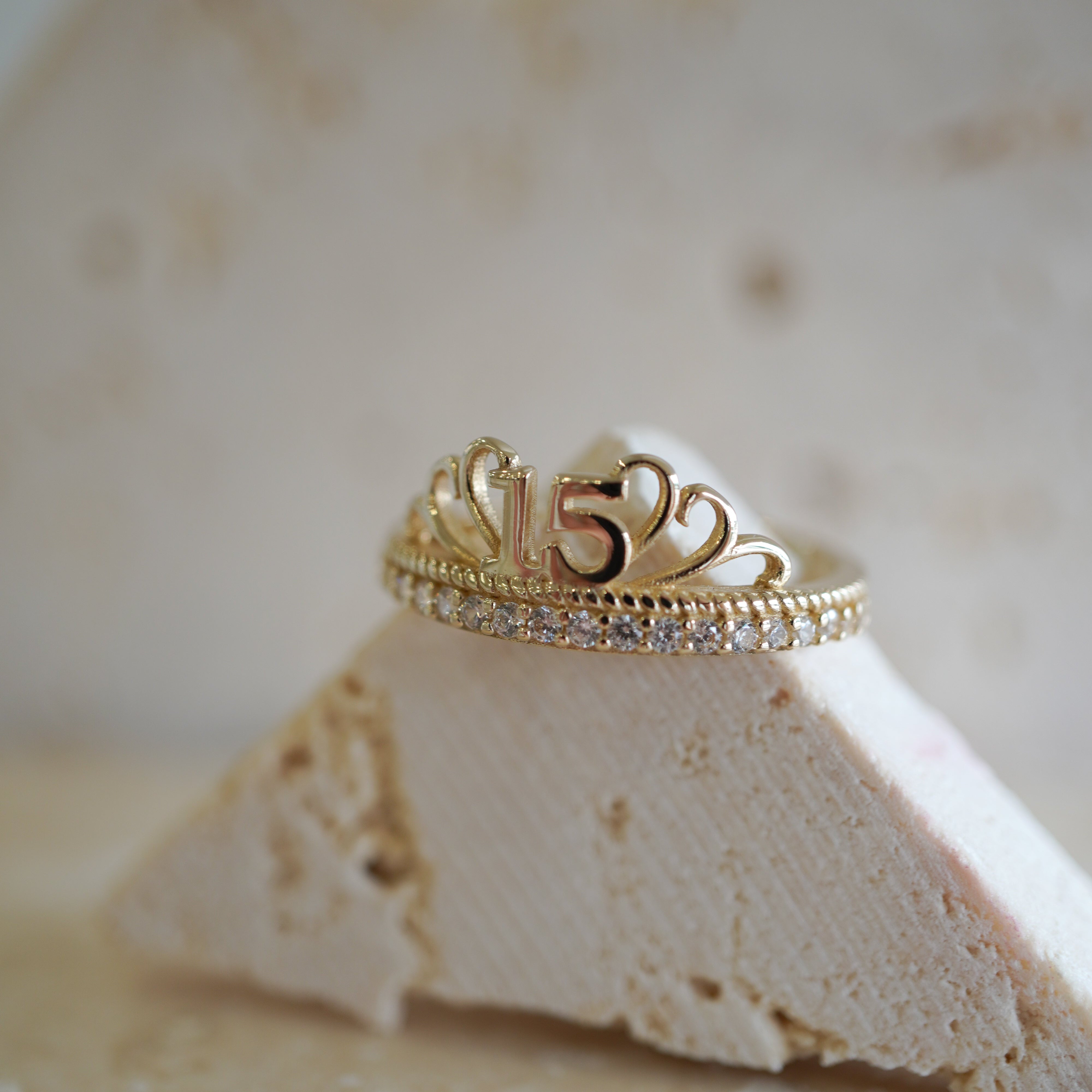 Mark a cherished moment with this elegant 14k yellow gold ring, designed especially for quinceañeras. Its timeless style and warm gold hue symbolize beauty and tradition, making it a precious keepsake to honor this unforgettable celebration. Perfect for expressing love and commitment on this special day.