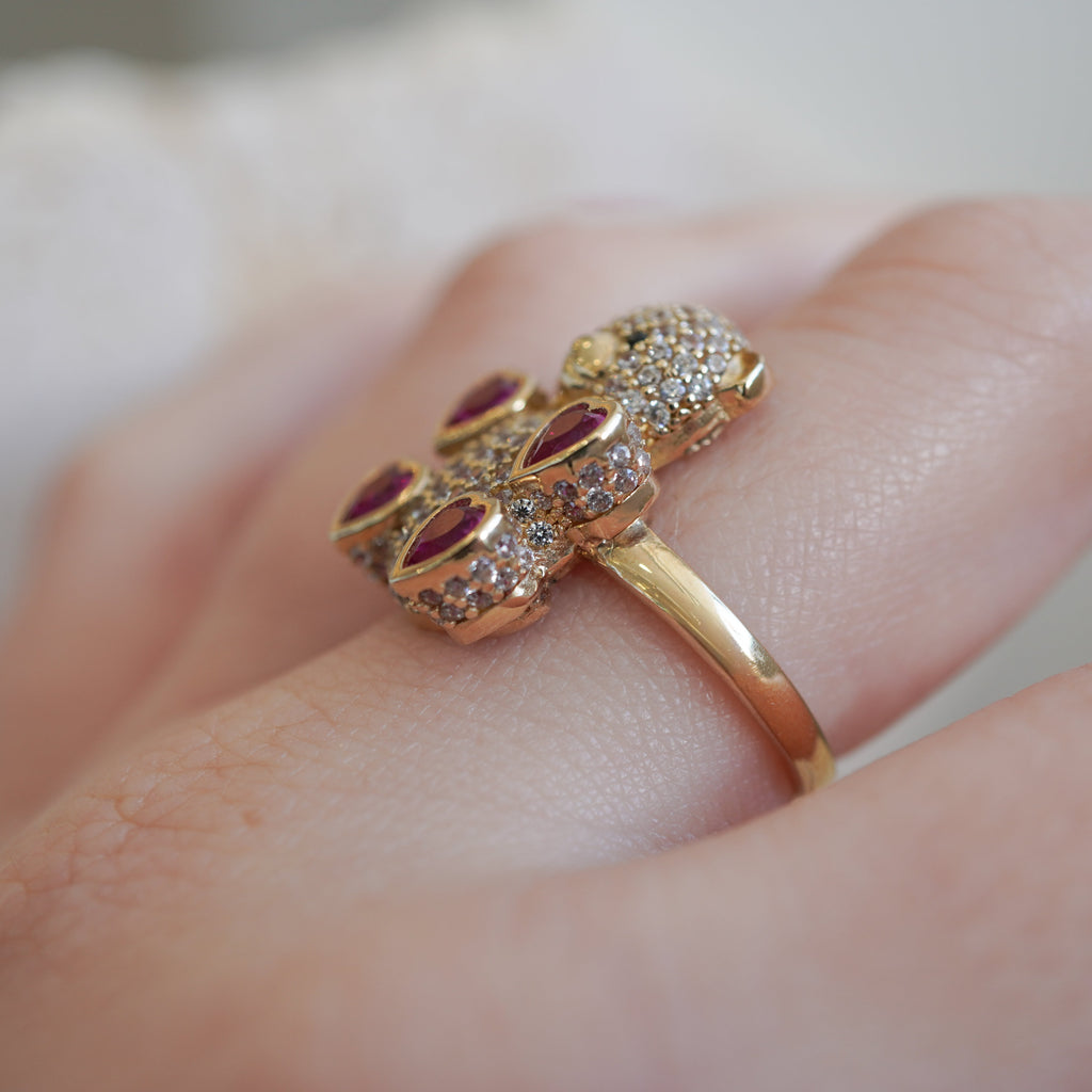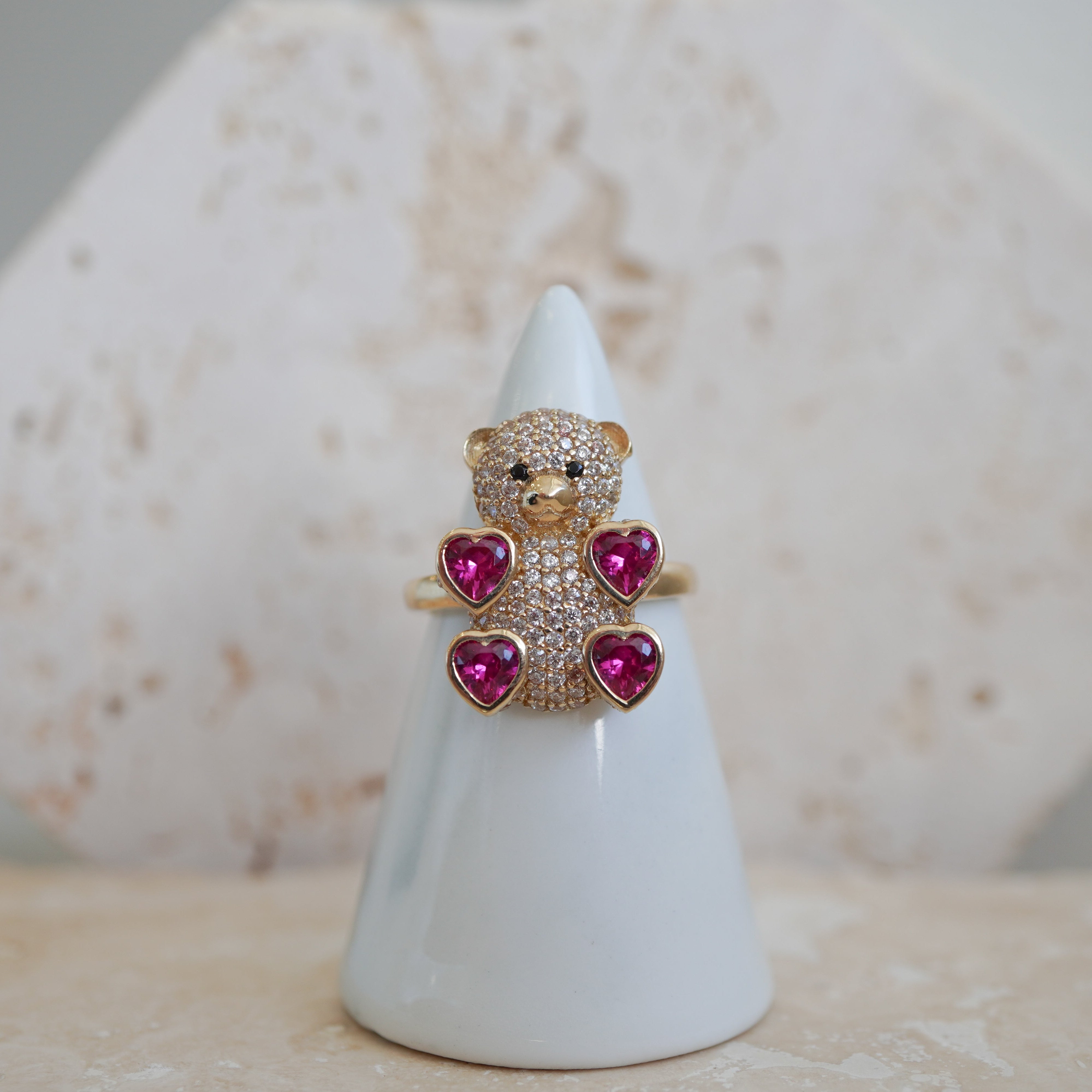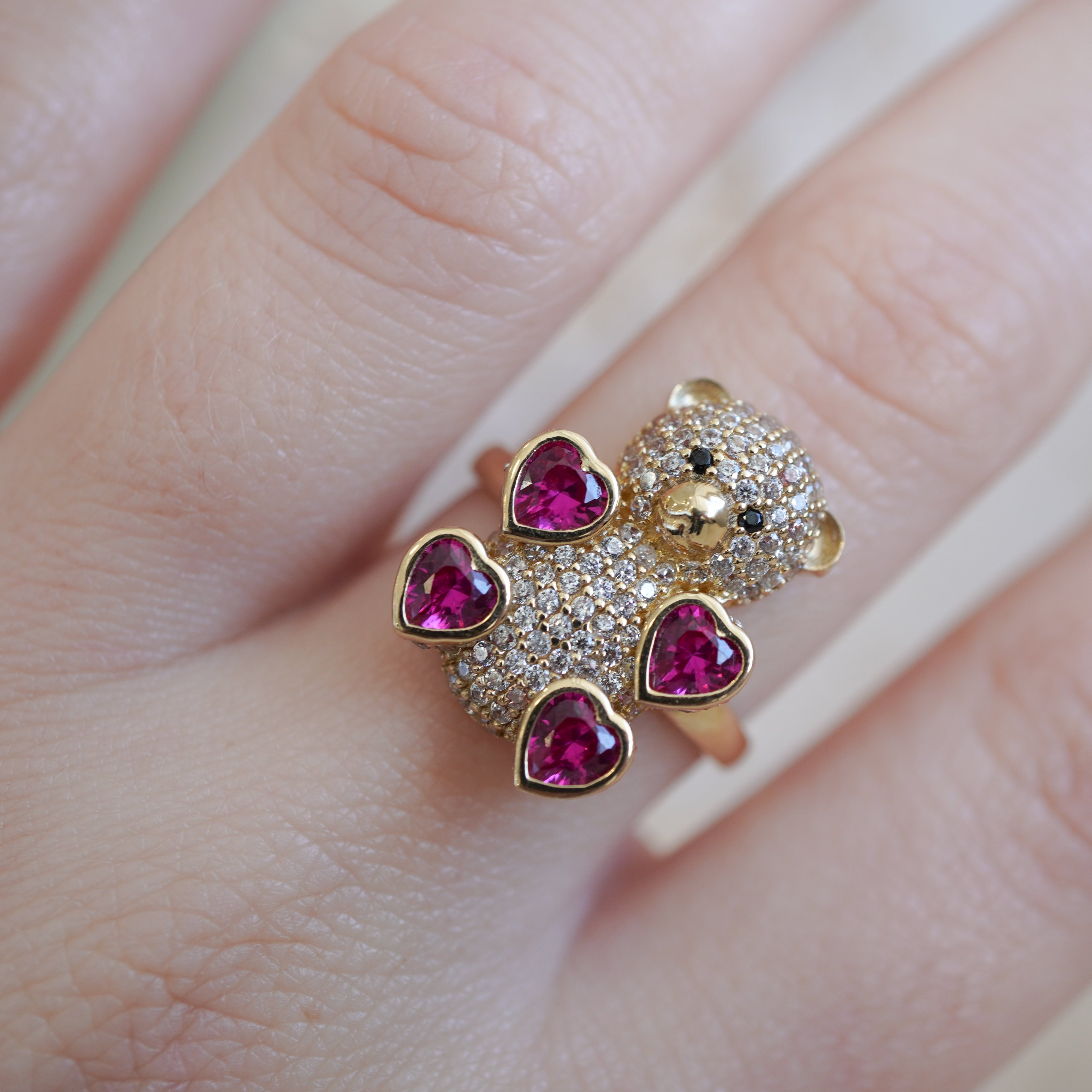 This 10k yellow gold bear ring combines delicate craftsmanship with stylish design, featuring tiny heart-shaped paws set with vibrant fuchsia zirconia stones. Perfect for those who want a unique and elegant piece that draws attention, it adds a playful yet sophisticated flair to any outfit. Whether for a special gift or a personal treat, this ring beautifully expresses charm and individuality.