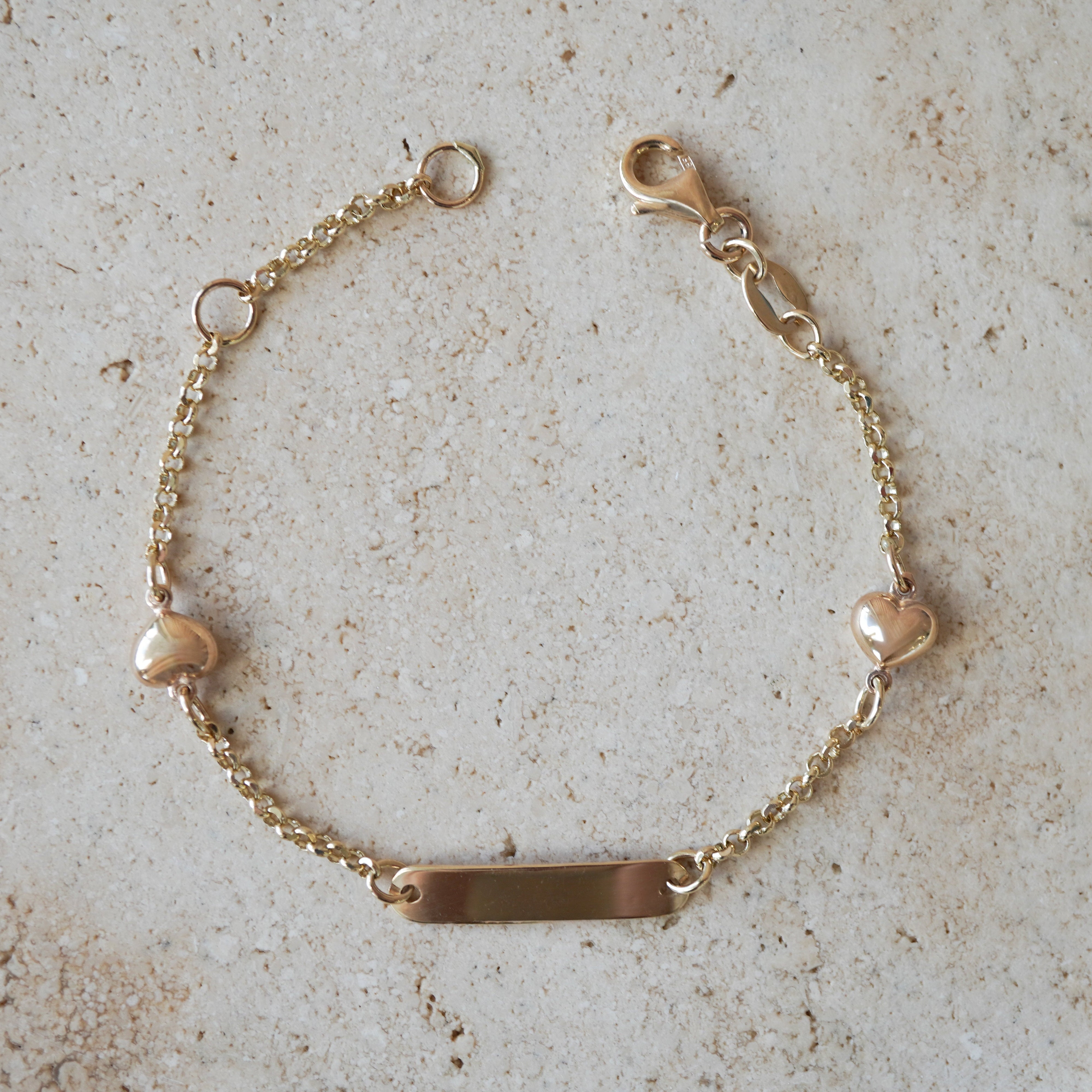 This elegant 14kt Baby ID Bracelet is a perfect keepsake to cherish. Featuring two delicate hearts flanking the nameplate, it adds a tender touch of love. Personalize it with your baby's name for free, making it a meaningful and unique gift that will be treasured for years to come. Crafted with care, this bracelet combines timeless beauty and heartfelt sentiment in one charming piece.